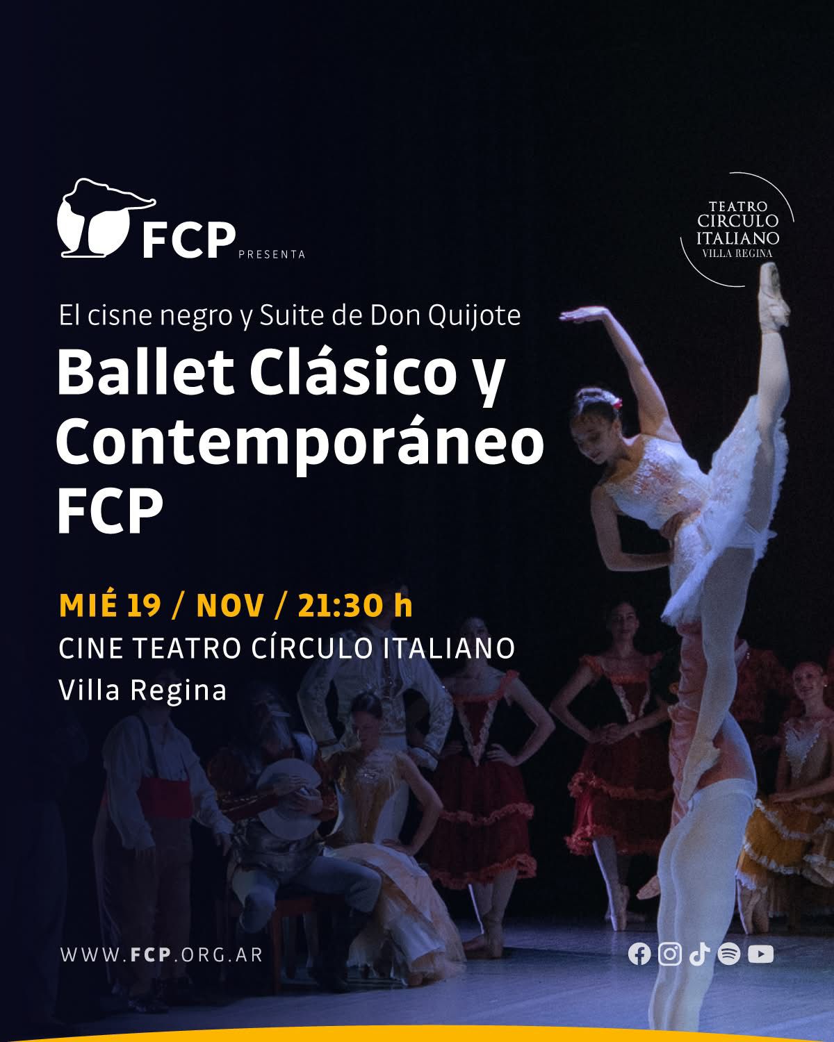 Fundación Cultural Patagonia presenta al Ballet Clásico y Contemporáneo FCP en Villa Regina con el espectáculo “El lago de los cisnes y Suite de Don Quijote”. La reconocida agrupación se presentará el miércoles 19 de noviembre a las 21,30 h en el Cine Teatro Círculo Italiano de Villa Regina.